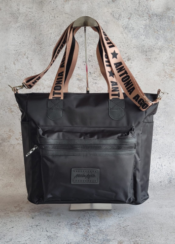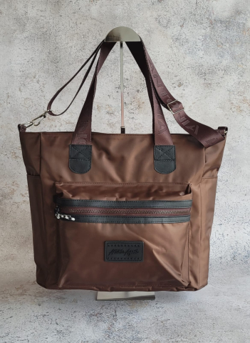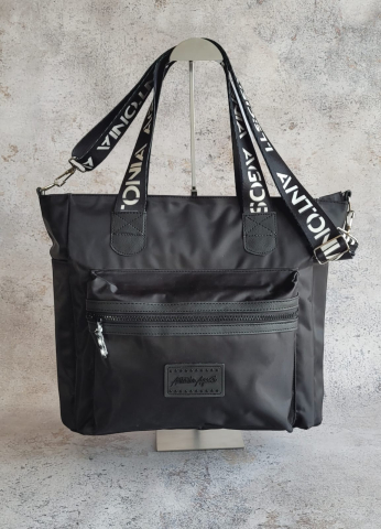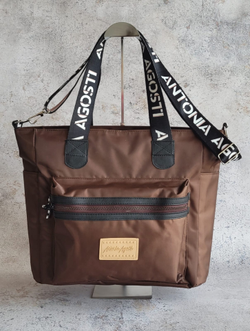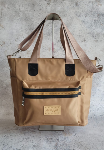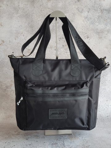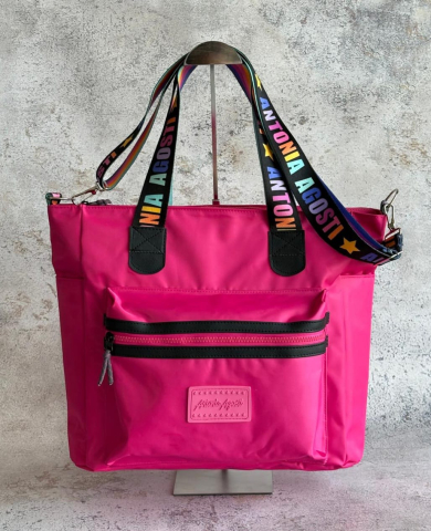 Tiene un gran bolsillo delantero envivado, las terminaciones de sus cierres son con cordones a tono y tiene la chapa PVC rectangular de Antonia en su frente.